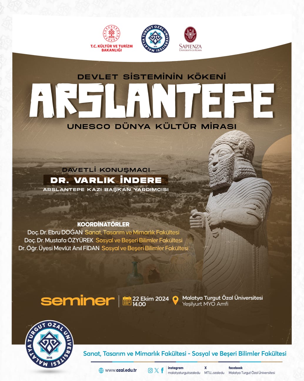 16 Ekim 2024 tarihinde planlanan etkinliğimizde deprem dolayısıyla sadece teknik gezi gerçekleştirilmiş olup Devlet sisteminin Kökeni 'Arslantepe' temalı seminerimiz 22 Ekim 2024 saat 14.00 'te Yeşilyurt Meslek Yüksek Okulunda yapılacaktır